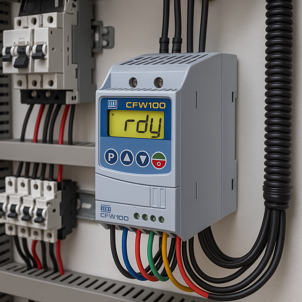 O Inversor de Frequência WEG CFW100 é um drive compacto desenvolvido para controle de velocidade e torque de motores de indução trifásicos, com modos de controle vetorial (VVW) ou escalar (V/f). Ideal para aplicações de pequeno porte, com interface HMI integrada, comunicação Modbus e possibilidade de execução de lógica interna (SoftPLC).